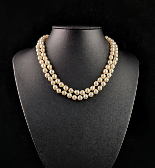 Vintage Double row Cultured Pearl necklace, 9k yellow gold and Turquoise clasp