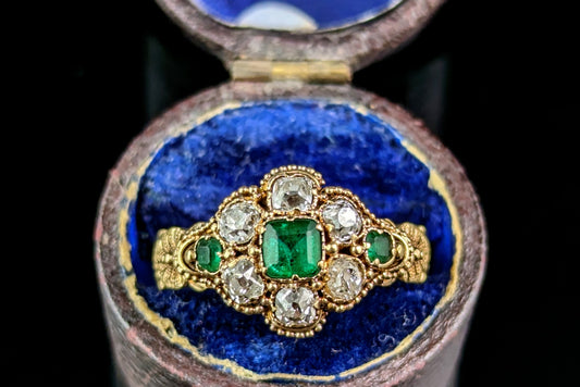 Antique Emerald and Diamond floral cluster ring, 18ct yellow gold