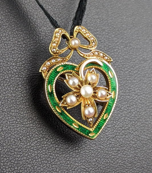Antique Green Enamel and Pearl Heart pendant, 9ct gold