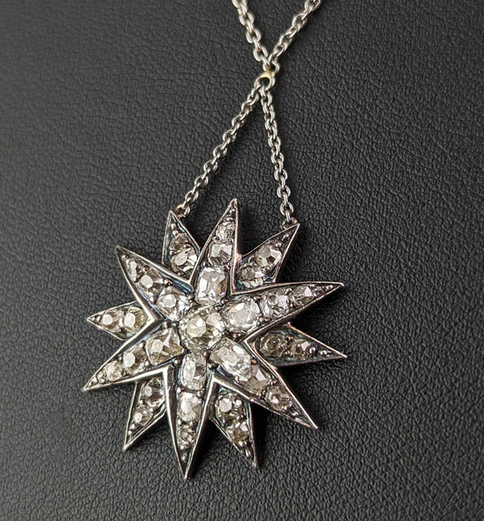 Antique Diamond Star pendant, sterling silver necklace, Victorian