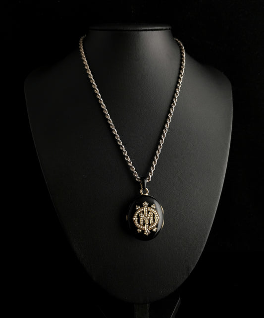 Victorian mourning locket, Black enamel and seed pearl, IMO