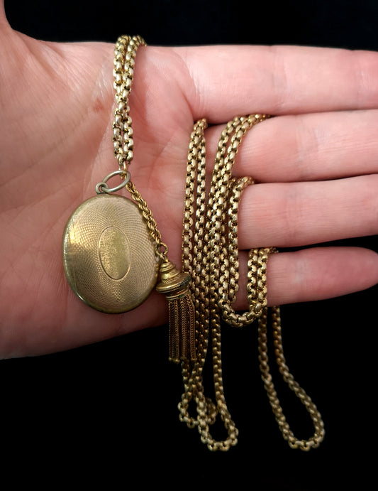 Antique Victorian longuard chain, muff chain necklace, locket and tassle