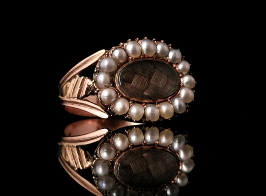 Antique Georgian mourning ring, 18ct gold, pearl and hairwork