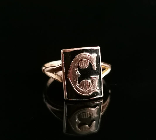Victorian mourning ring, initial C, 9ct Rose gold, black enamel