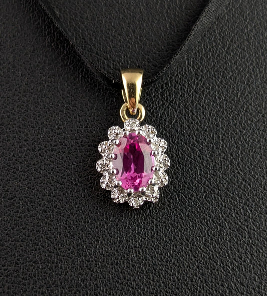 Vintage Synthetic Pink Sapphire and Diamond cluster pendant, 9ct gold