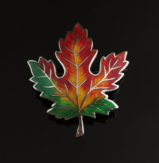 Vintage sterling silver, guilloche enamel, Maple leaf brooch