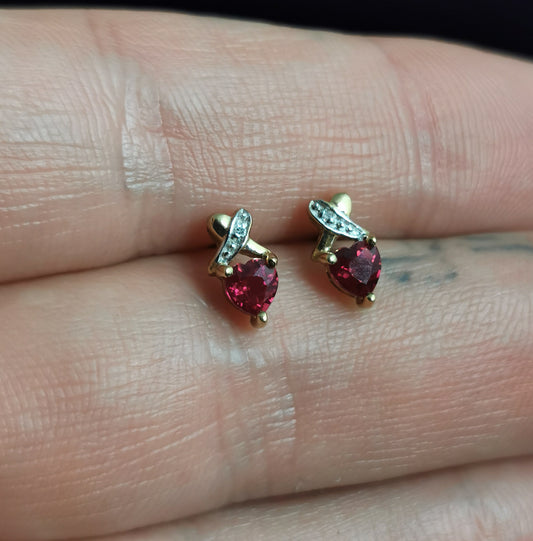 Vintage Synthetic Ruby and Diamond Heart earrings, studs, 9ct gold