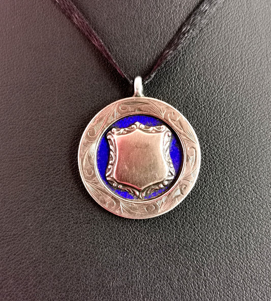 Vintage Sterling silver, 9ct Rose gold and blue enamel fob pendant
