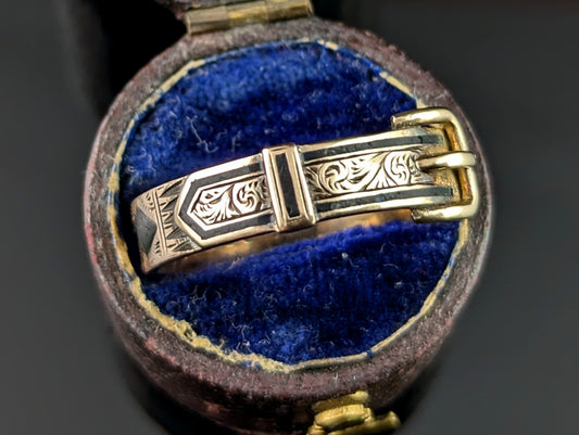 Antique Buckle mourning ring, 9ct gold and Black enamel