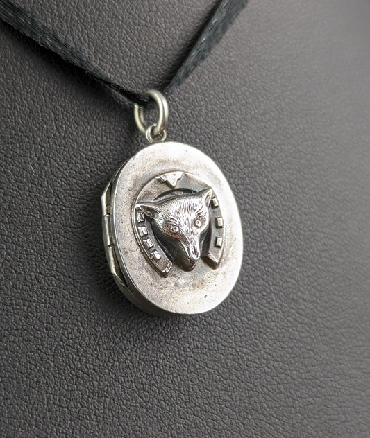 Antique Victorian silver Fox and Horseshoe locket pendant