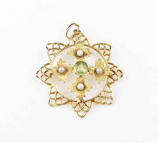 Antique Peridot and Pearl flower pendant, 9ct gold, Edwardian