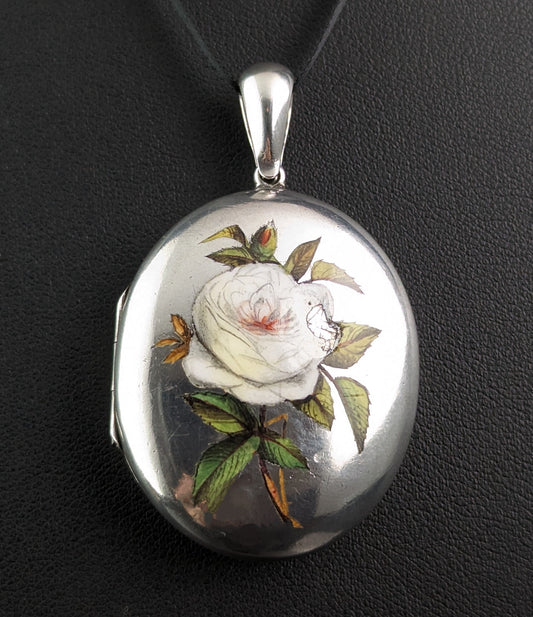 Antique Enamelled silver locket, White Rose, Victorian