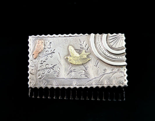 Antique Aesthetic locket brooch, Owl and Swallow, Sterling silver