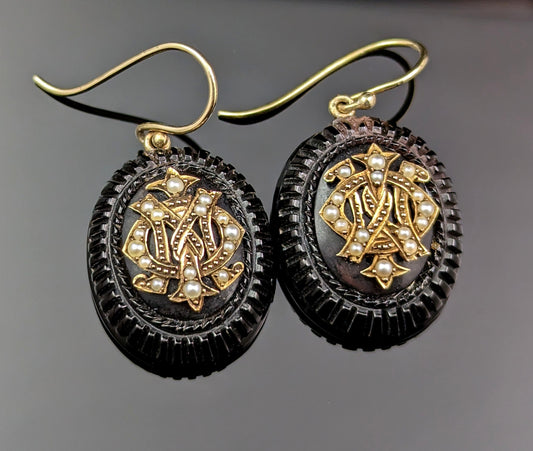 Antique Whitby Jet Mourning earrings, IMO, 9ct gold and Seed pearl