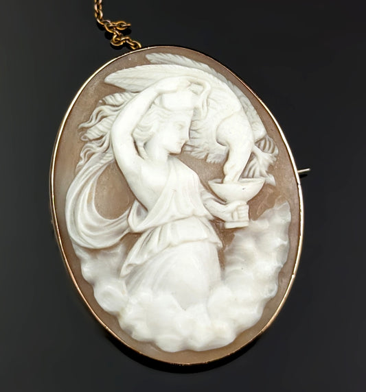 Antique cameo brooch, 9ct gold, Hebe and the Eagle Zeus