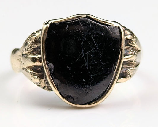 Antique Jet signet ring, Lion Paw, shield shaped, 9ct gold