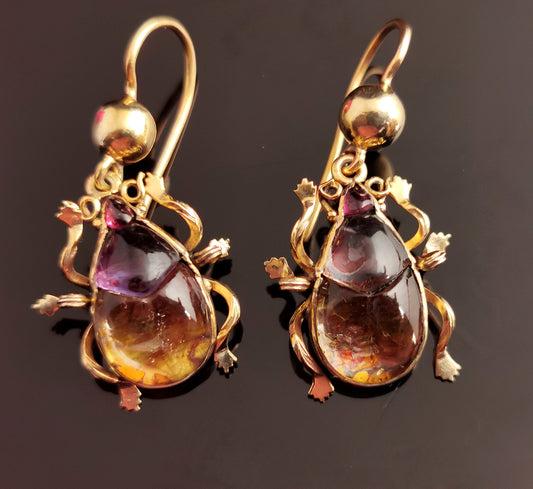 Antique Victorian beetle earrings, 9ct gold, Egyptian revival