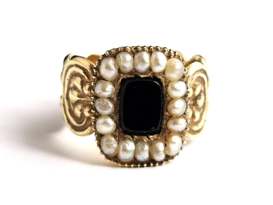 Antique Regency mourning ring, 18ct gold, Onyx and pearl