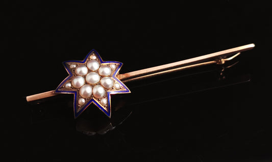Antique Star brooch, pearl and blue enamel, 9ct gold