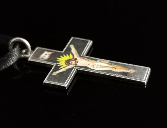 Antique Edwardian silver and enamel Cross pendant, INRI