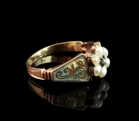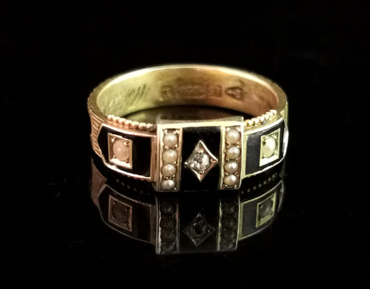 Victorian mourning ring, 15ct gold, pearl, black enamel and hairwork