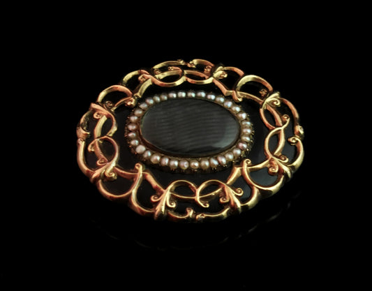 Victorian mourning brooch, 9ct gold, hairwork and seed pearl