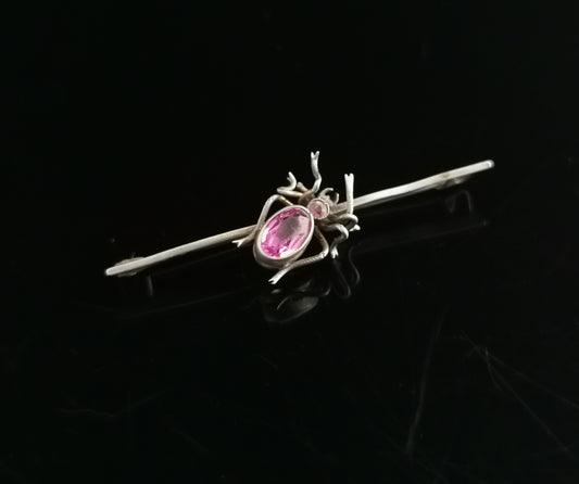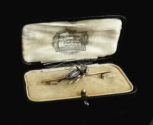 Antique Moonstone beetle brooch, Ruby, Diamond and Garnet, 15ct gold, boxed