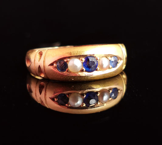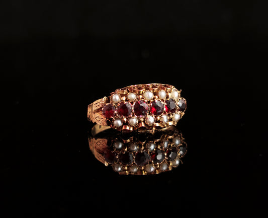 Victorian Garnet and Pearl ring, 15ct gold, engraved