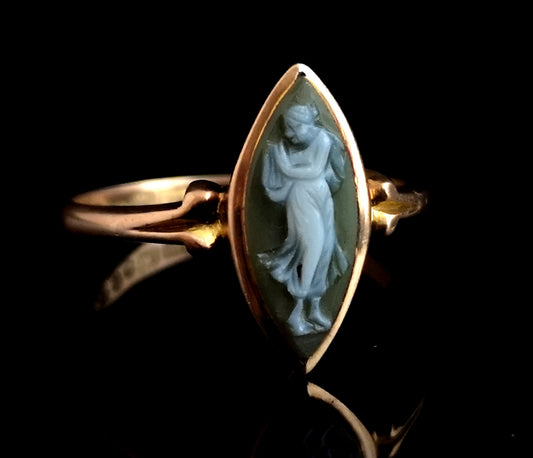 Antique Cameo navette ring, 9ct Rose gold, Green agate