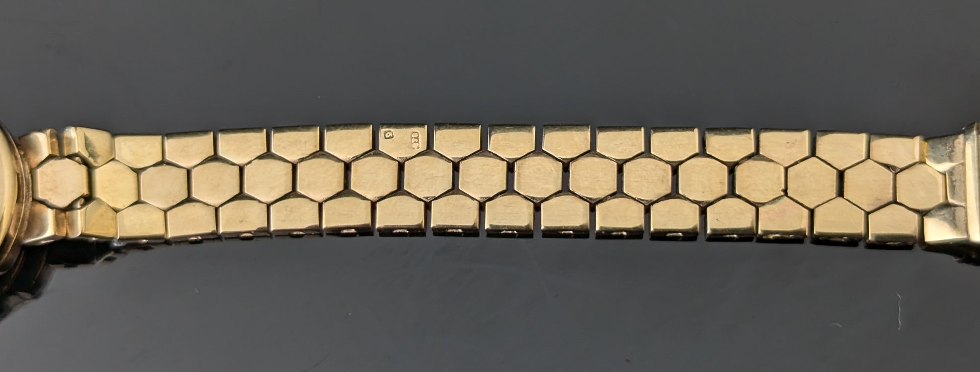 It comes on a gorgeous 9ct yellow gold bracelet strap with a brick link design and a textured finish