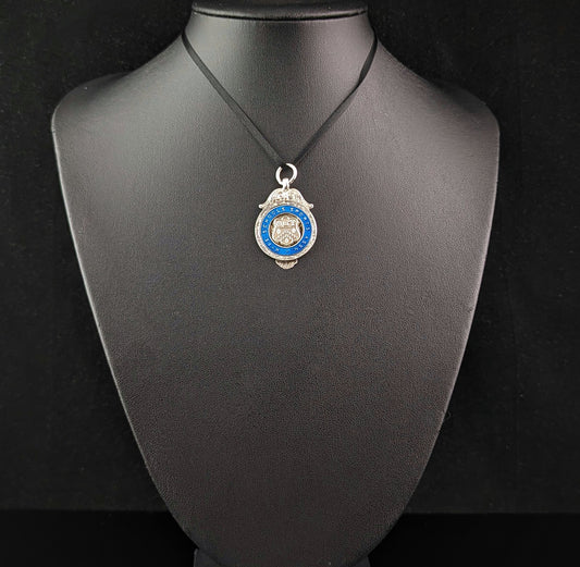 Vintage sterling silver and blue enamel fob pendant, Sports