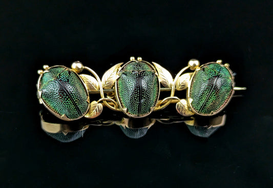 Antique Scarab beetle brooch, 9ct gold, Leaves, Egyptian revival