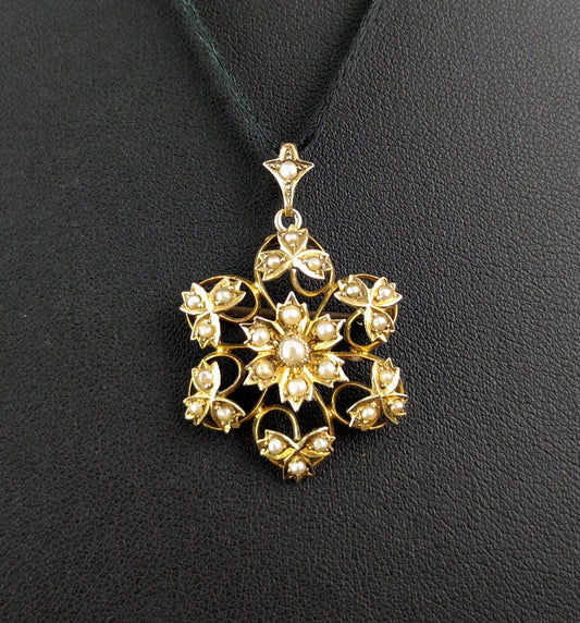 Antique Pearl flower pendant brooch, 9ct gold, Art Nouveau