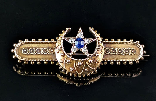 Antique Crescent moon and Star brooch, Sapphire and Diamond, 15ct gold, boxed