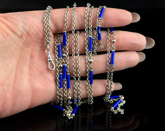 Antique silver long chain necklace, longuard chain, Blue enamel