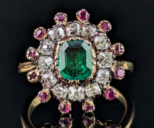 Antique Georgian Emerald, Diamond and Ruby cluster ring, 18ct yellow gold