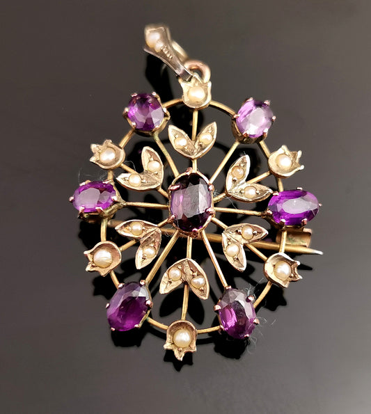Antique Art Nouveau Amethyst and pearl pendant brooch, Floral Starburst, 9ct gold