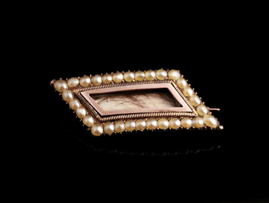 Antique Georgian mourning brooch, 9ct Rose gold, pearl, Rhomboid