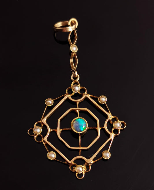Antique Opal and seed pearl pendant, 15ct gold, Art Nouveau