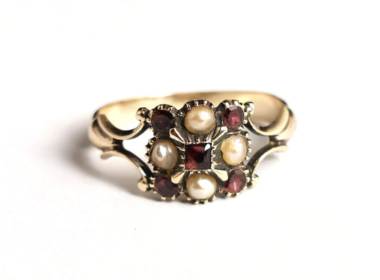Antique Regency Garnet and seed pearl ring, 9ct yellow gold