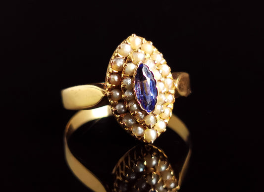 Antique blue paste and seed pearl navette ring, 9ct yellow gold