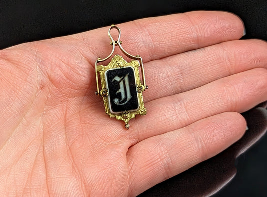Antique Swivel Fob Locket pendant, Onyx J, 9ct gold, Cameo