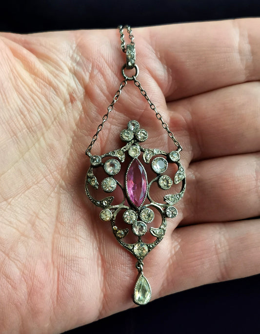 Antique Belle Epoque paste drop pendant necklace, sterling silver