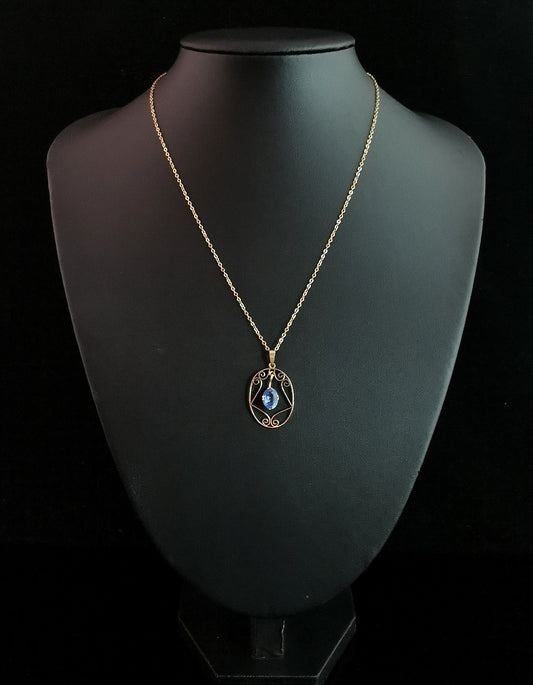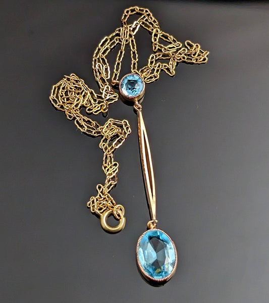 Antique Art Deco drop pendant, 9ct gold necklace, Blue paste